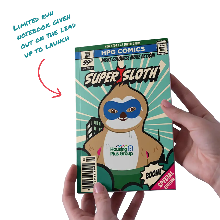 The breakthrough came unexpectedly: a leftover soft toy sloth in the office became the inspiration for the platform mascot. Initially designed for “Super Users” (staff champions who would help drive adoption), the sloth quickly became the face of Workvivo itself.